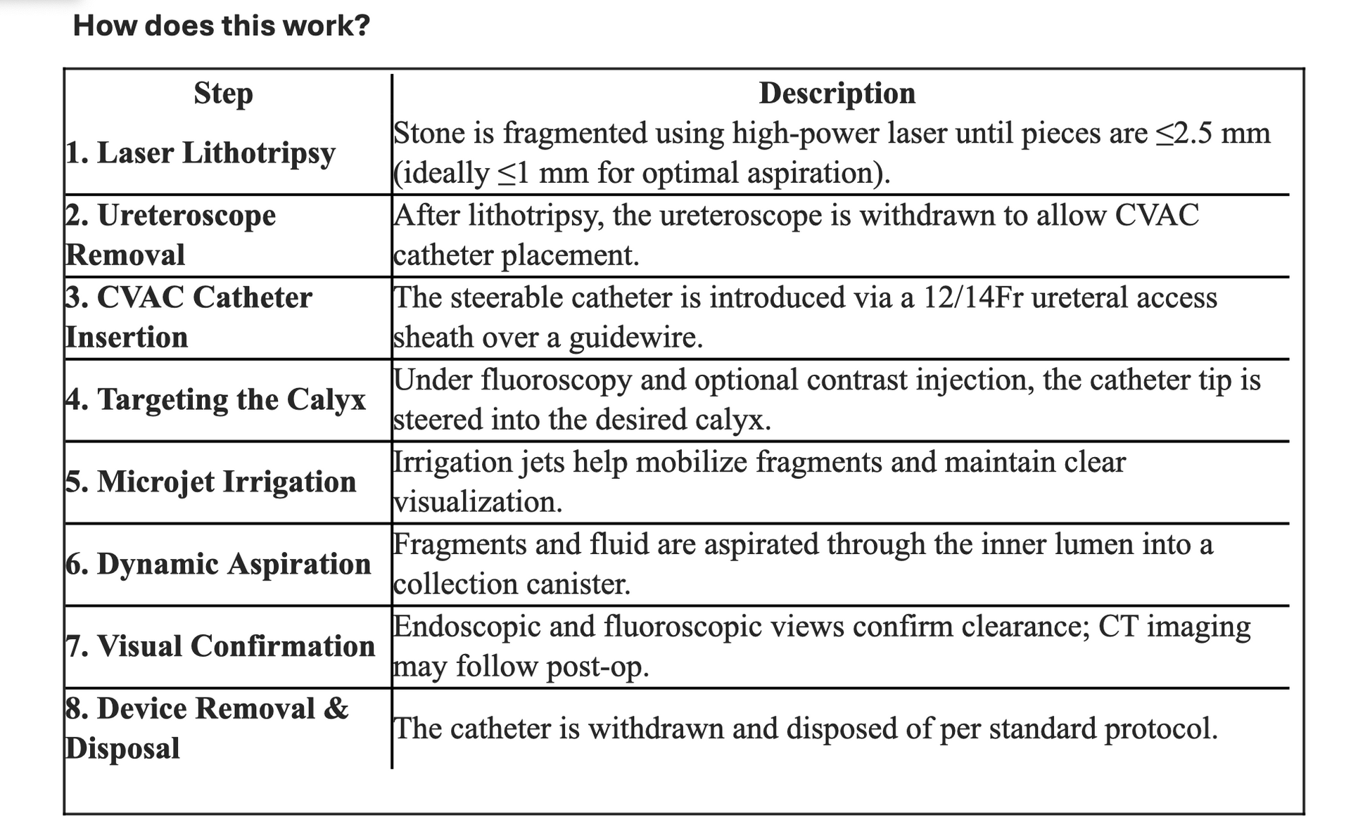 “Following laser lithotripsy, a steerable CVAC catheter was introduced via access sheath. Under fluoroscopic guidance, microjet irrigation and aspiration were performed to evacuate stone fragments into the collection canister. Clearance confirmed endoscopically.”