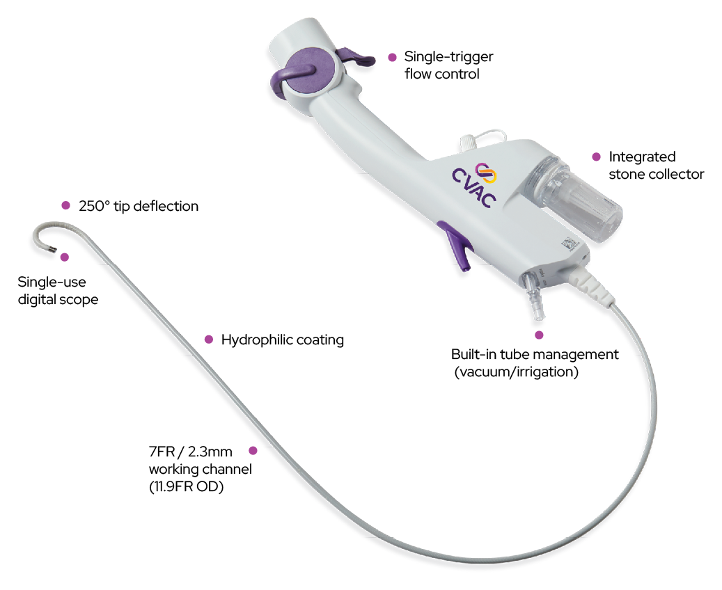 The SURE Procedure (Steerable Ureteroscopic Renal Evacuation) is a minimally invasive technique for kidney stone management using the Controlled Vacuum Assisted Clearance (CVAC) system. This single-use device enables continuous irrigation and aspiration during laser lithotripsy, enhancing stone fragment clearance from the renal collecting system.