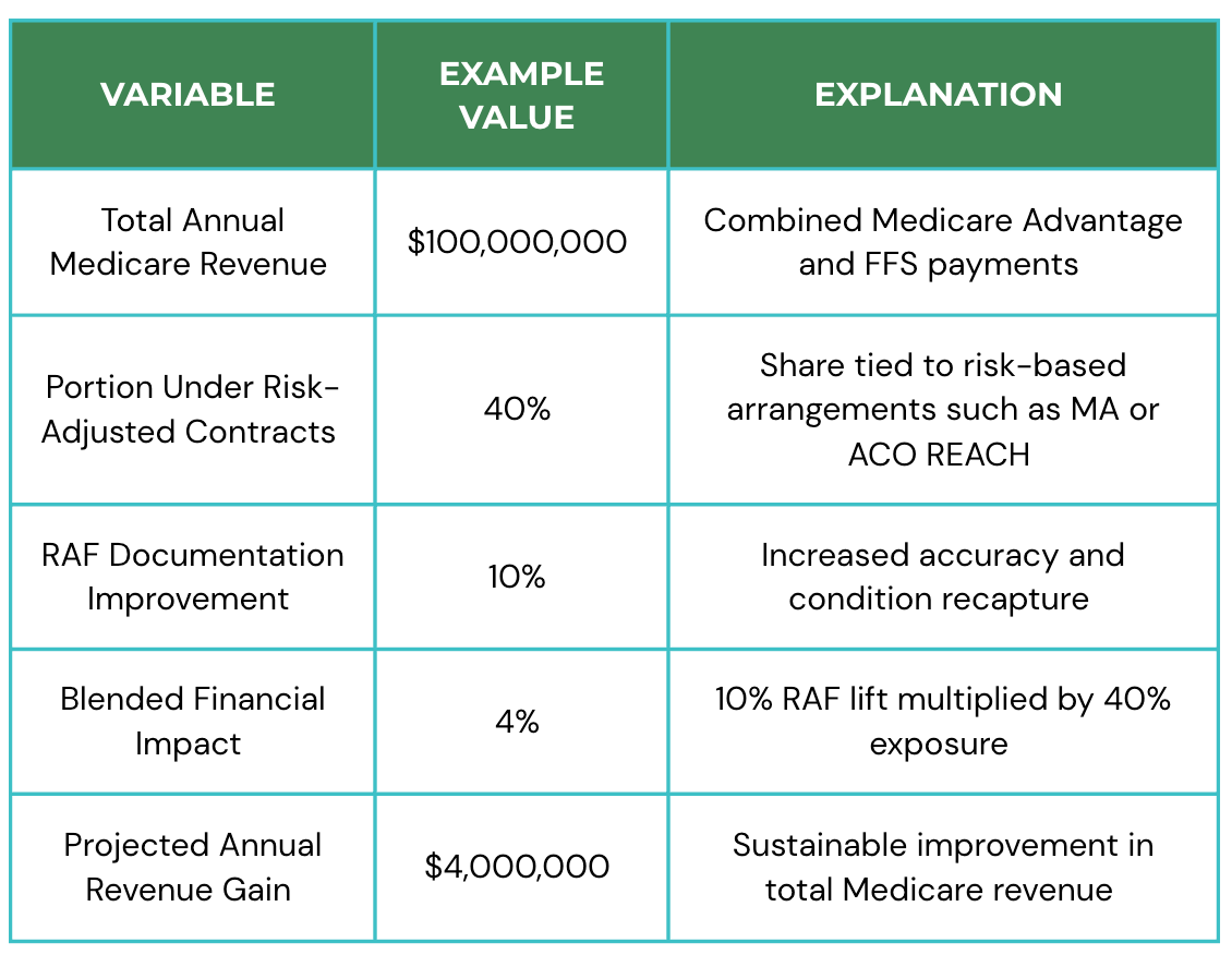 A 10% improvement in RAF accuracy yields a 4% blended revenue lift, or approximately $4 million in additional reimbursement. This gain comes entirely from better documentation and coding precision, not from increasing patient volume.